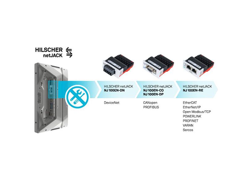 Con i moduli Hilscher netJACK disponibili come optional, è possibile integrare nel MES9000 vari tipi di bus di campo nonché Real Time Ethernet come master o slave. L'integrazione può essere eseguita rapidamente e facilmente senza alcuno strumento.
