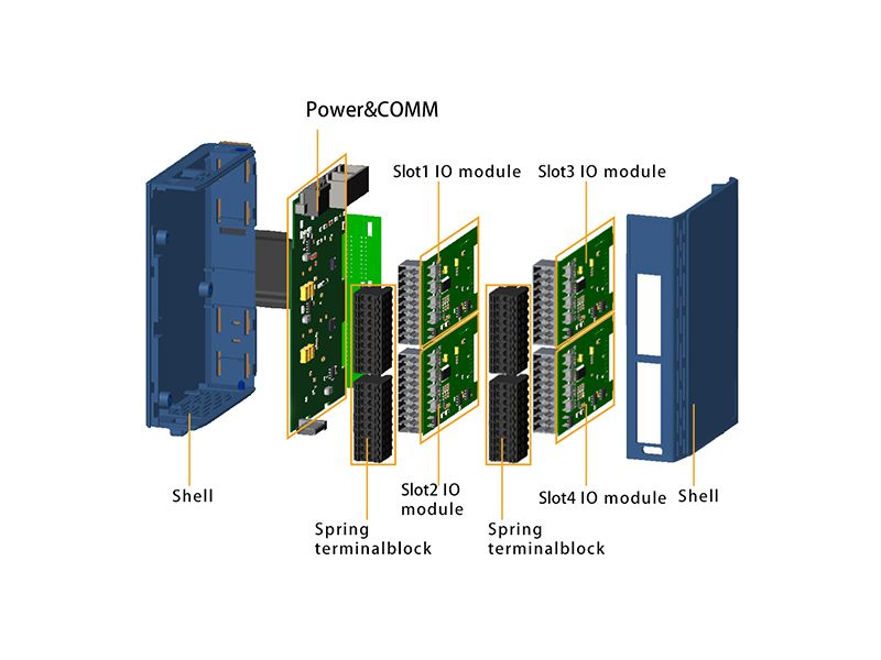 La B SERIES di ODOT è un modulo I/O integrato con combinazioni modulari. L’alimentazione e la scheda COMM si trovano nella parte inferiore, mentre i moduli IO comunicano con la scheda COMM attraverso il backplane. Il modulo è in grado di supportare un’espansione massima di 2/4 slot IO.